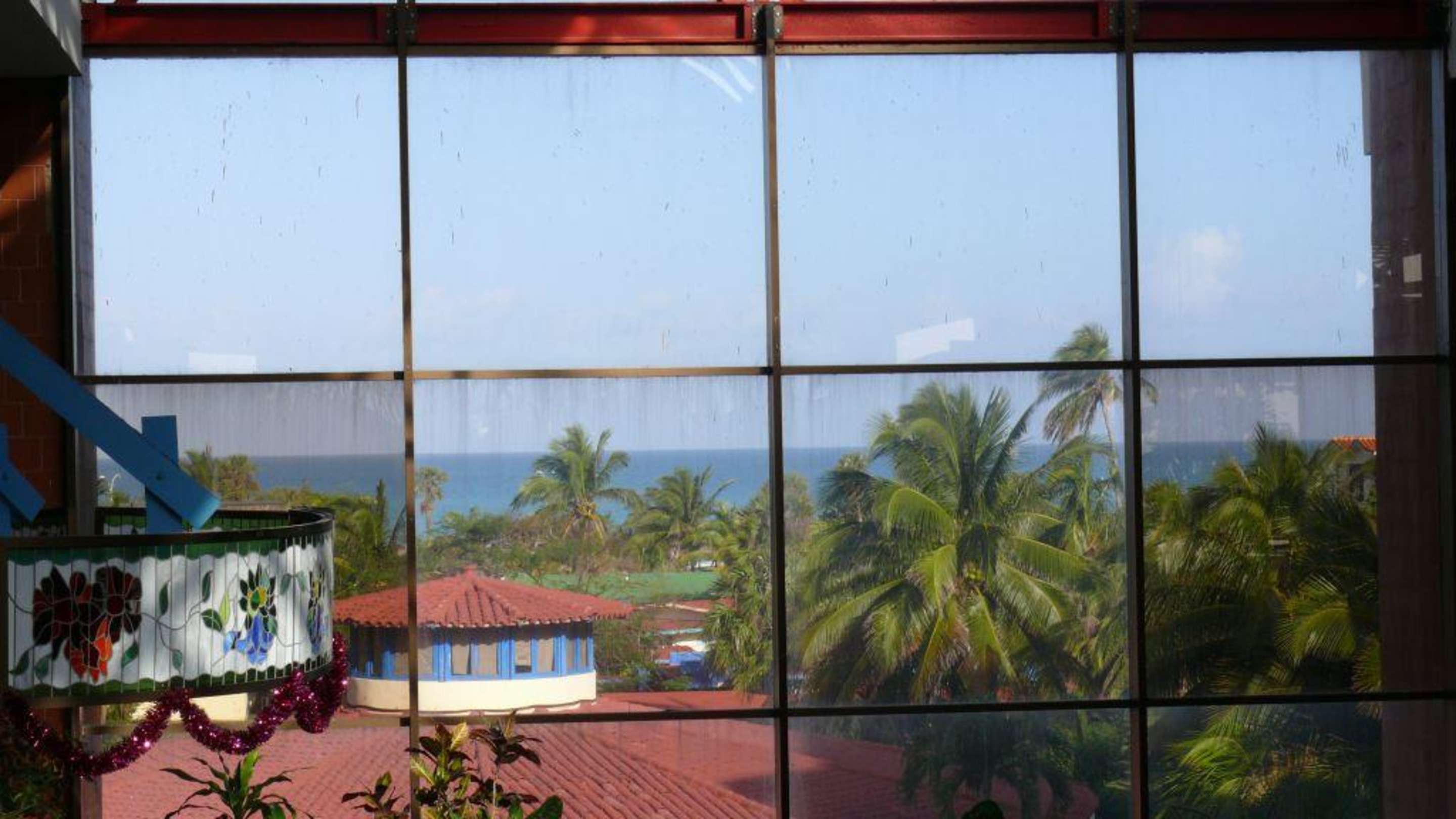 Blick vom Haupteingang durch die Glasfront in der Lobby