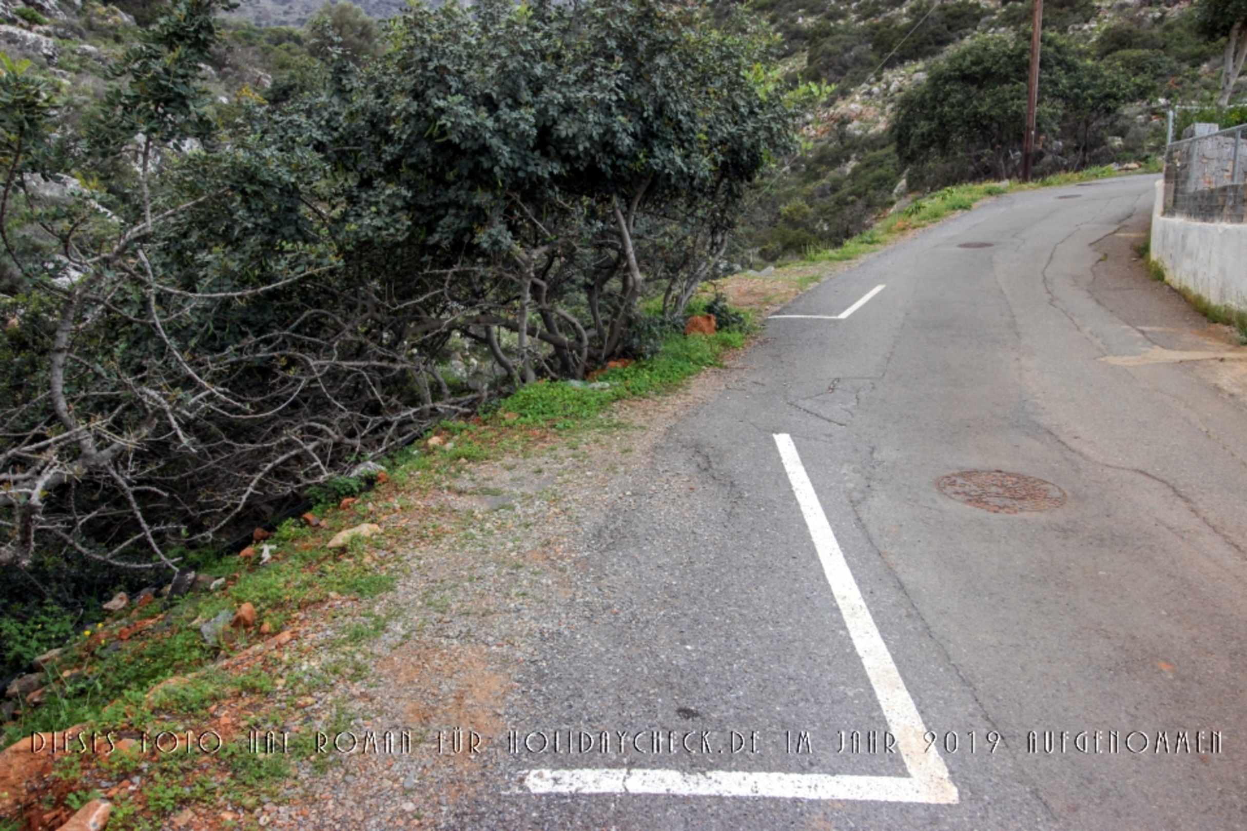 Parken am Abgrund. Entlang eines Abgrundes wurden Parkmarkierungen angebracht. Beim Parken an diesen Stellen ist äußerste Vorsicht geboten, soll das Auto nicht im Graben landen. Rechts im Bild die Mauer um die Hotelanlage.