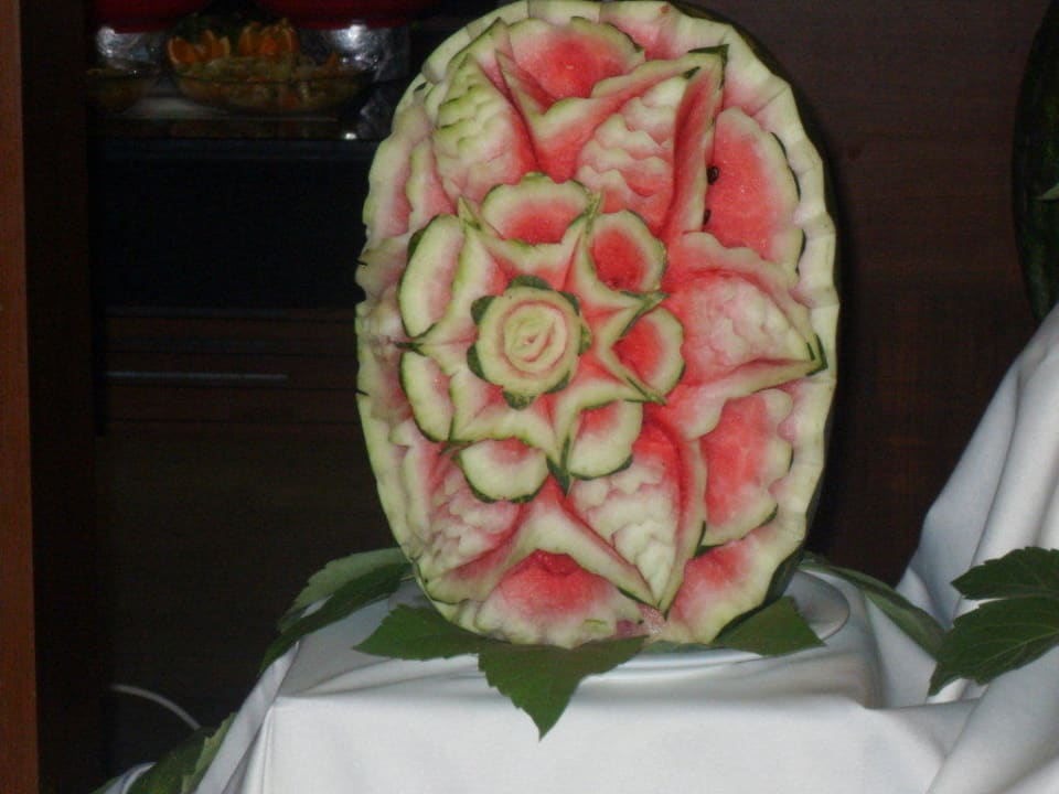 So kunstvoll wurde die Melone für das Bufett arrangiert
