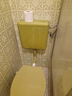 Zimmer 14 - Uralte Standtoilette. Spülkasten mit unappetittlichen Kalkläufern.