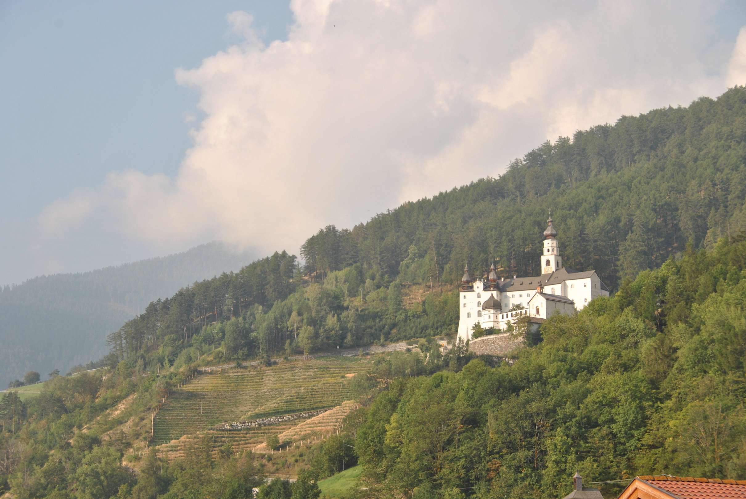 Blick auf Kloster Marienberg von der Zimmerterrass Hotel Weisses Kreuz