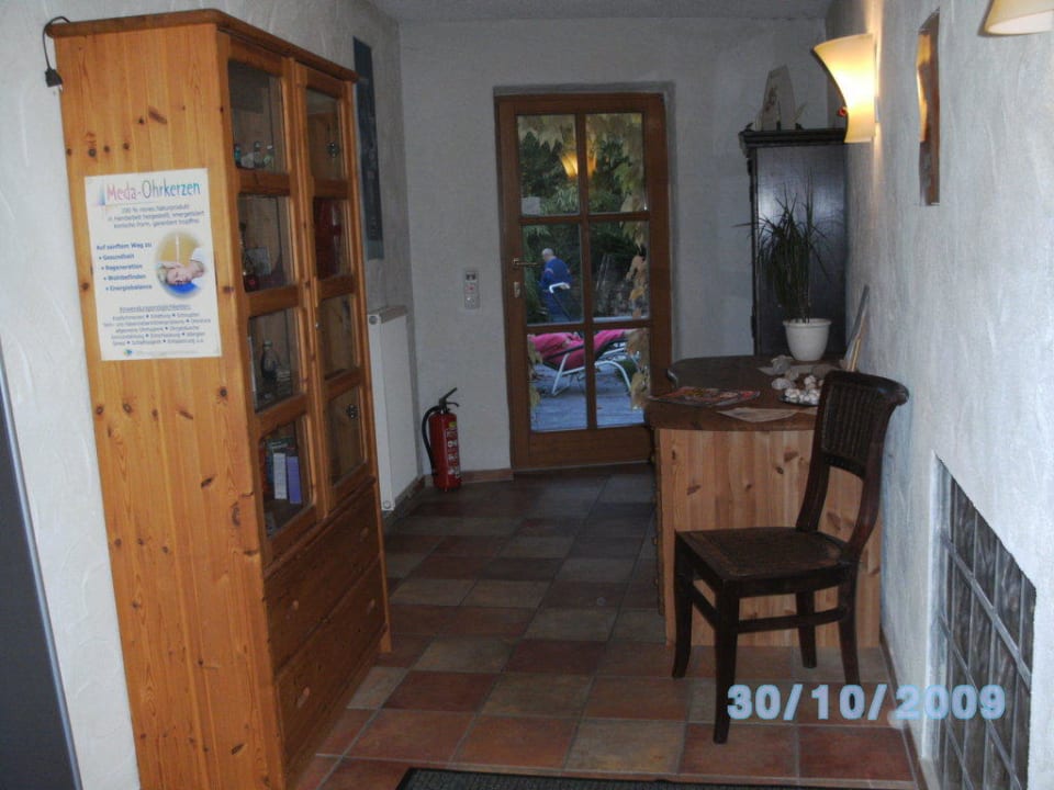 Vor dem Massagezimmerhier kann man gemütlich auf seine anwendung warten. dazu durch den wellnessbereich amjungbrunnen vorbei die treppe hoch.