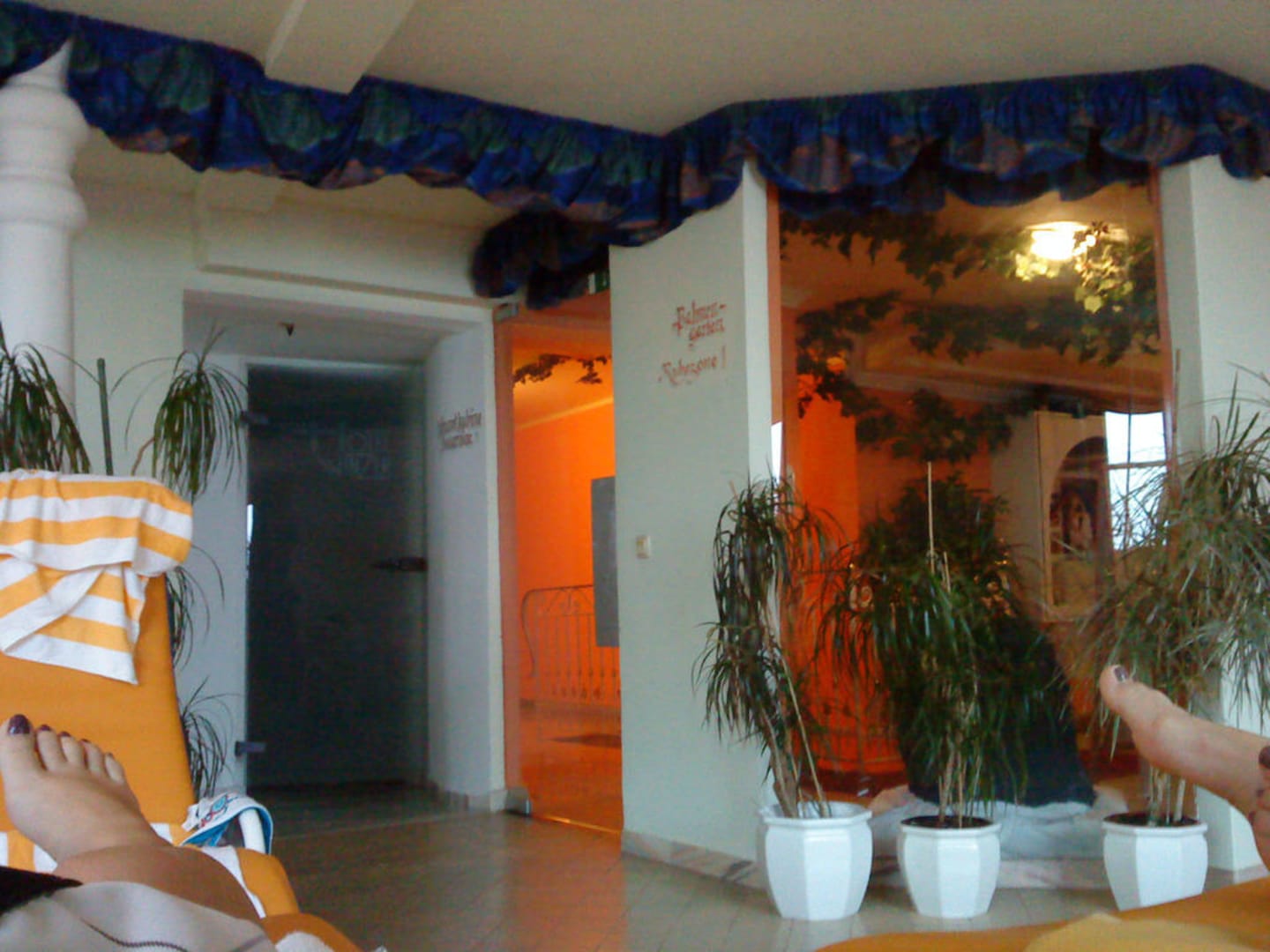 Rüschenvorhang, oben auf der Decke Kunstefeu...Wohlfühlfaktor = 0, auch die Palmen im Vordergrund waren nicht begeistert vom Ambiente