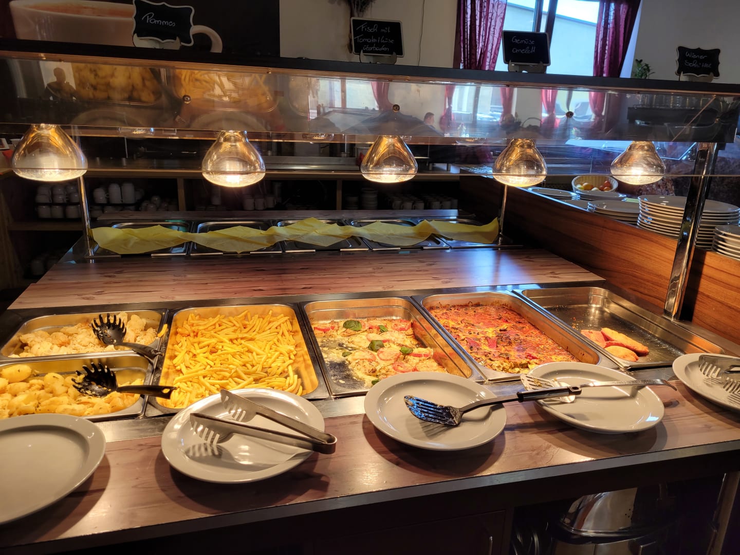 GastroReste vom Abendessen, am nächsten Tag zu Mittag Kartoffel, Blumenkohl, Pommes, Fisch mit Tomaten und Käse überbacken, Gemüseomlett, Wienerschnitzel