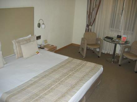 Das Bett ist breit, aber auch hier kein normaler Schreibtisch, sondern lediglich ein runder Glastisch (?) Für mich ist das kein 5-Sterne Zimmer.