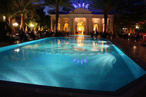 Pool mit Restaurant am Abend