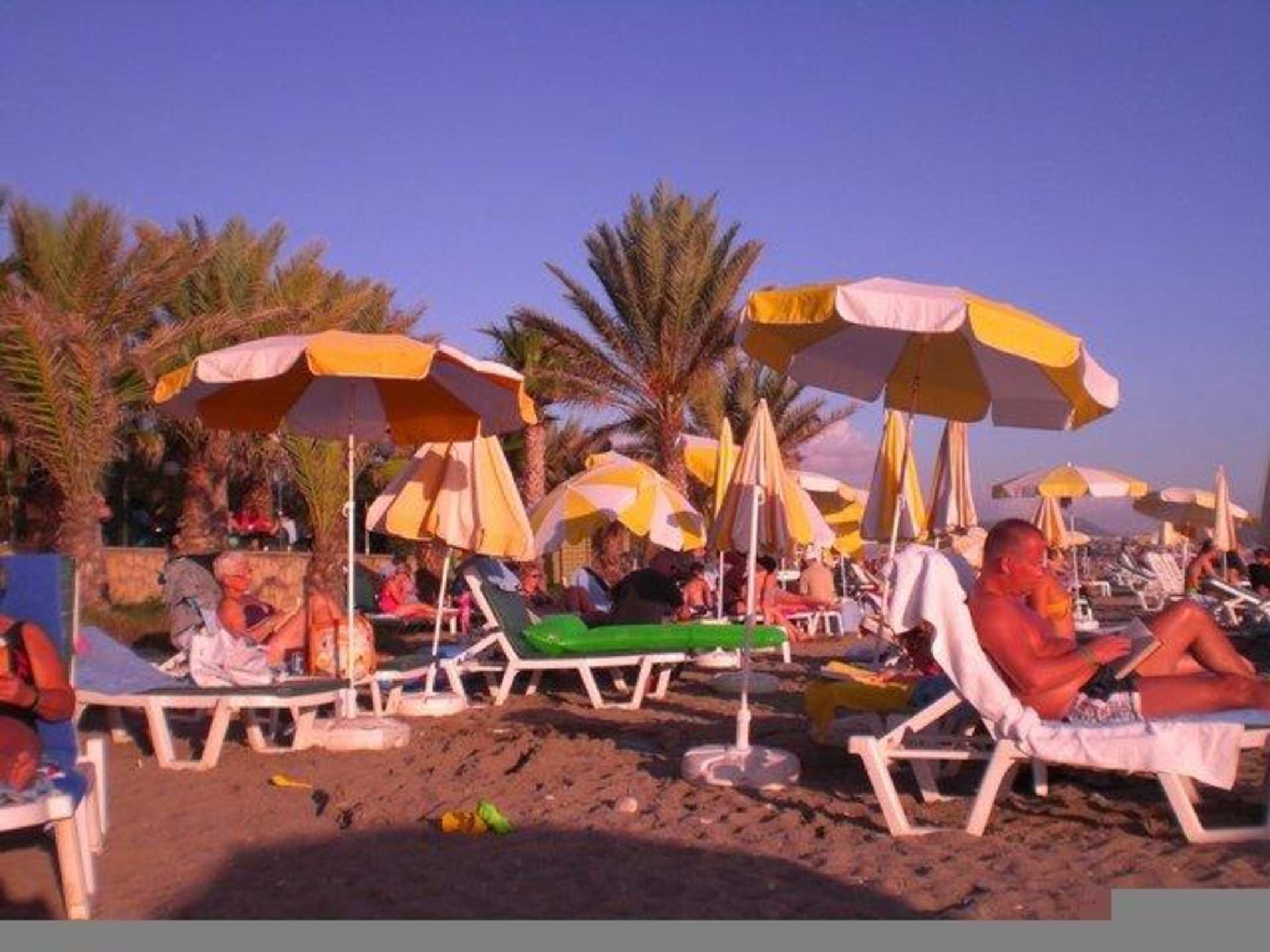 Strand mit Liegen und Sonnenschirmen