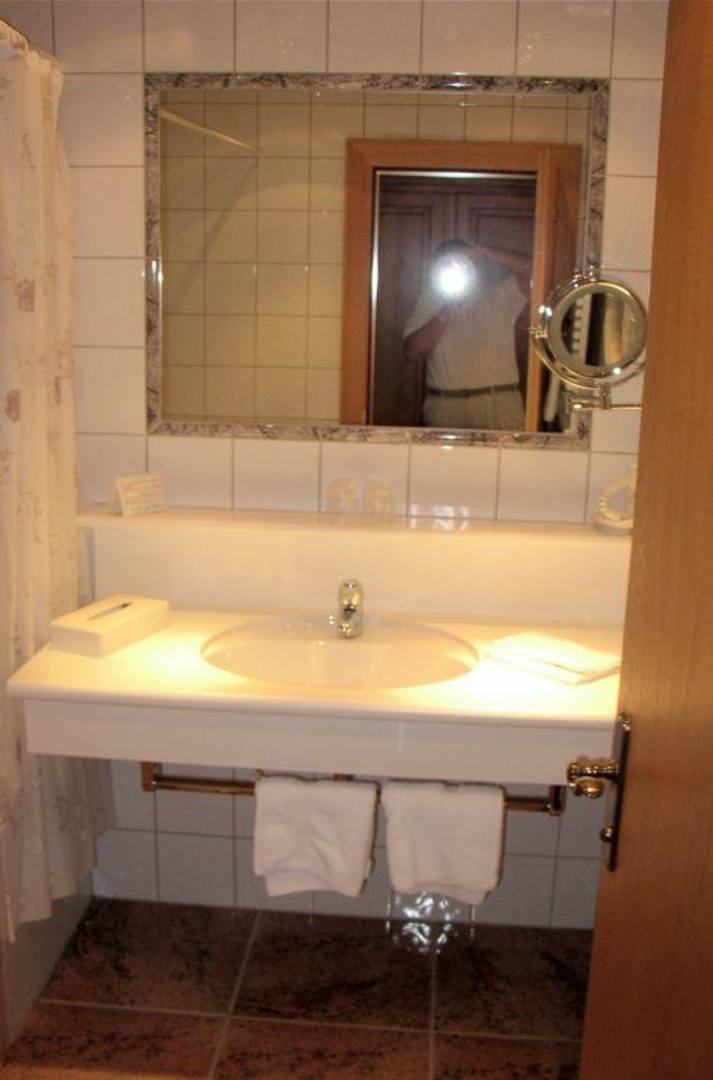 Teilansicht des separaten BadezimmersWaschbeckenbereich im Badezimmer. Bad und WC sind räumlich getrennt.