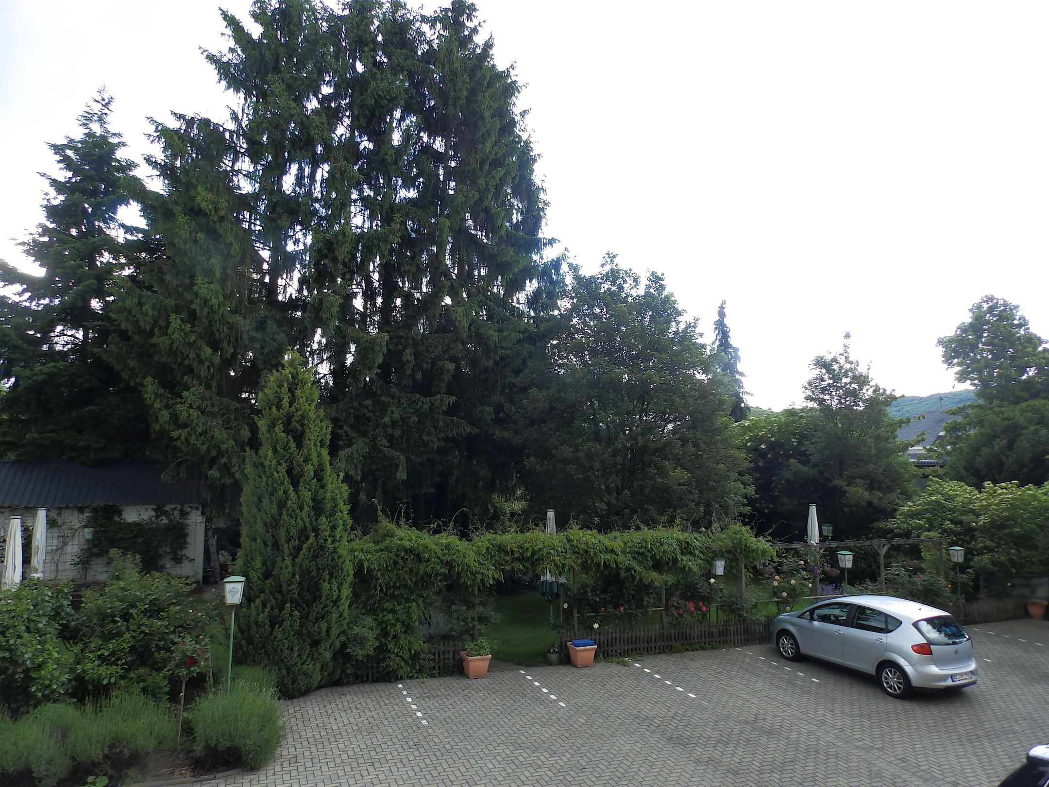 Parkplatz und dahinter der Garten