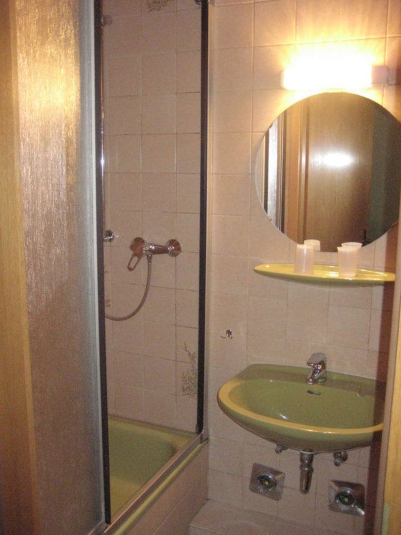 Wie man hier auf dem Bild bereits erkennen kann, ist der Einstieg in die Dusche sehr eng und auch sehr hoch, das Bad war immer kalt. Hier muss renoviert werden.