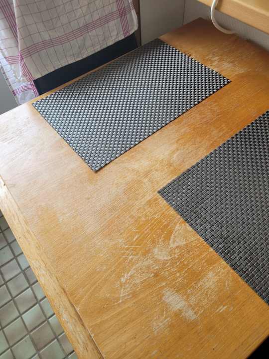 Stark abgenutzter Küchentisch.