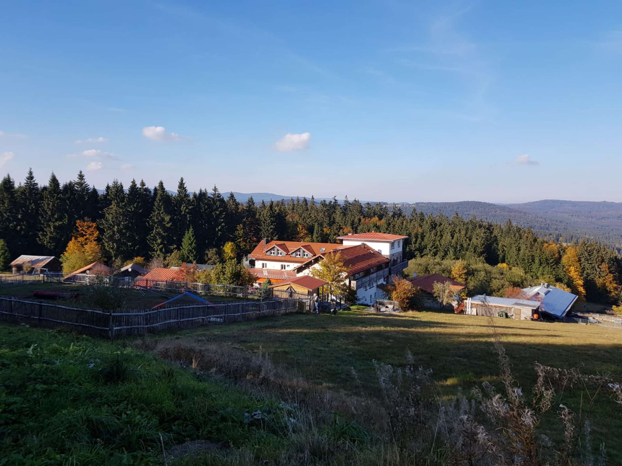 Blick auf Hotel und Hunde Parcours