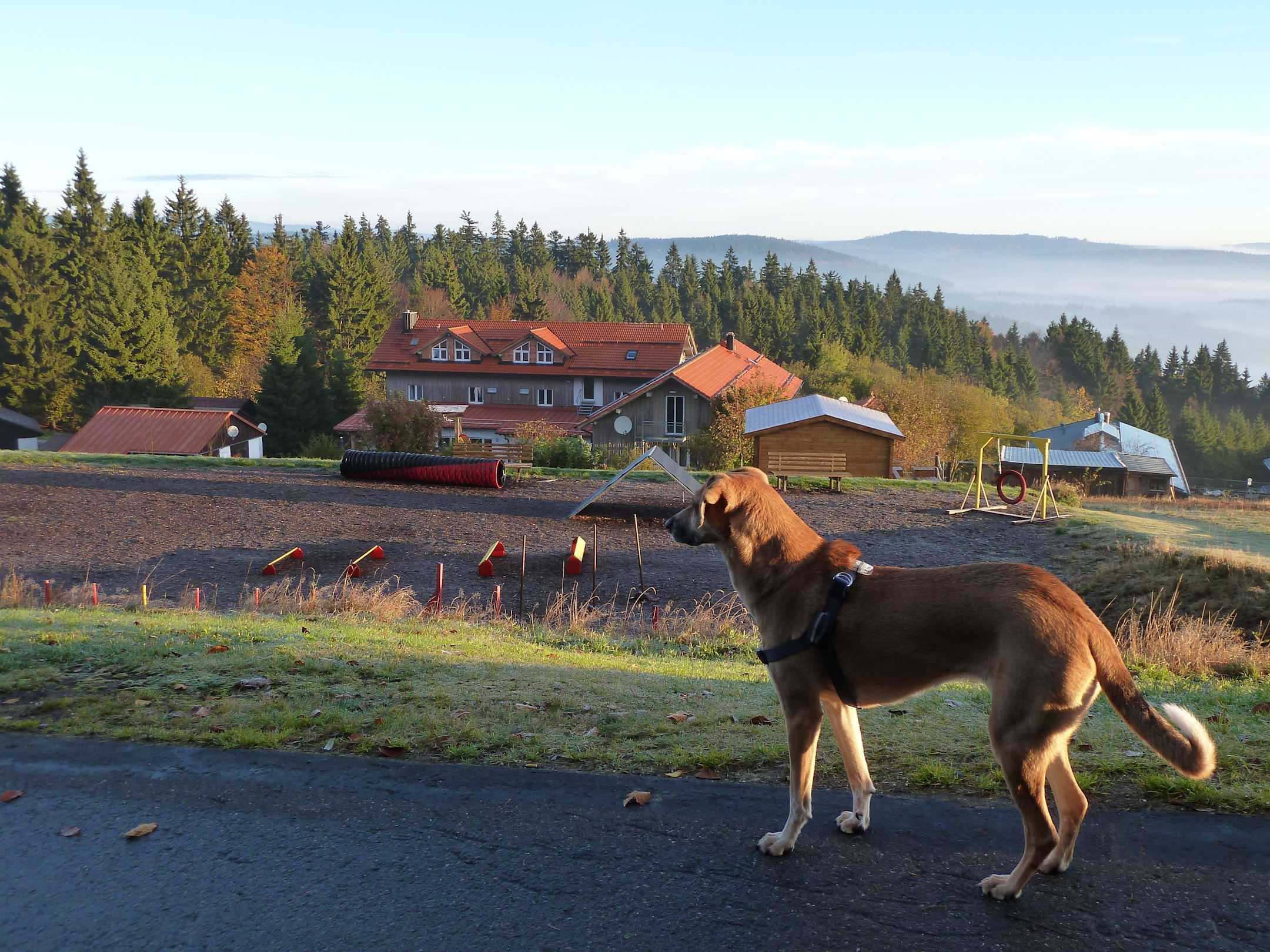 Landhotel vom Alzenberg-Waldrand aus gesehen. Mit Agility-Platz im Vordergrund.