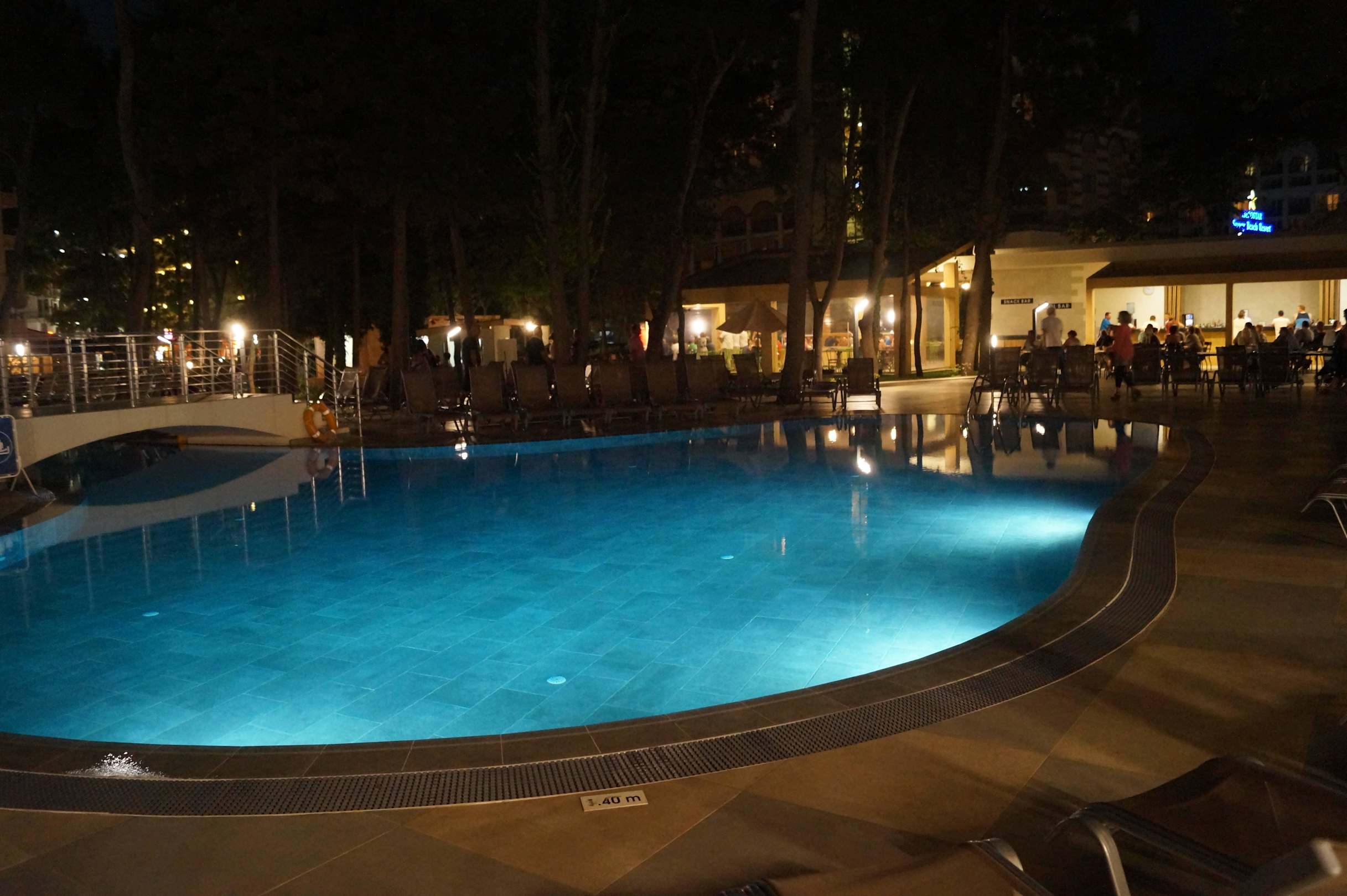 Beleuchteter Pool mit Partymeile im Hintergrund