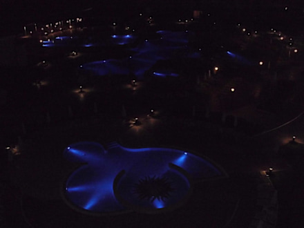 Hier sieht man die bei Dunkelheit schon blau illuminierte Poolanlage.