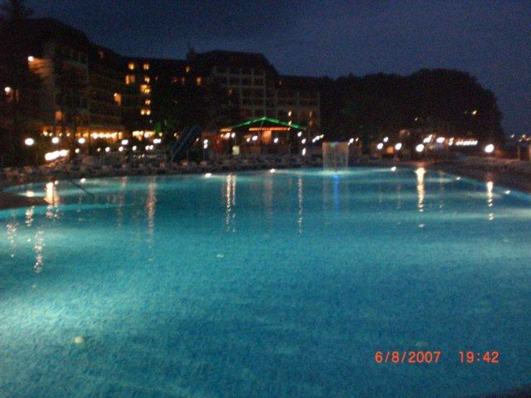 Pool und Hotel am AbendEs hat etwas magisches, am Abend am Strand spazieren zu gehen und so einen schönen Anblick vom Hotel zu haben.