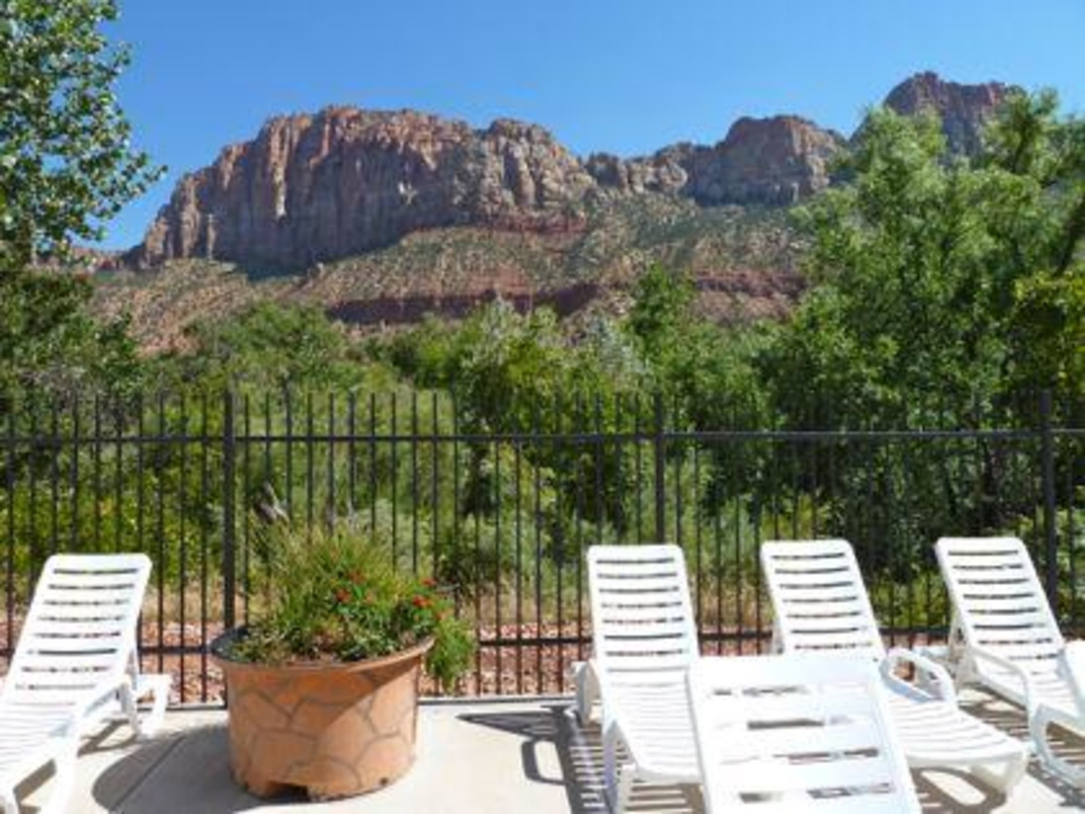 Blick vom Pool auf rote Felsen