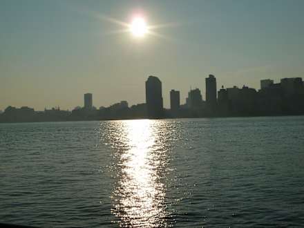 Blick vom Hotel "Hyatt Regency Jersey City on the Hudson" auf Upper Manhattan in der Morgensonne