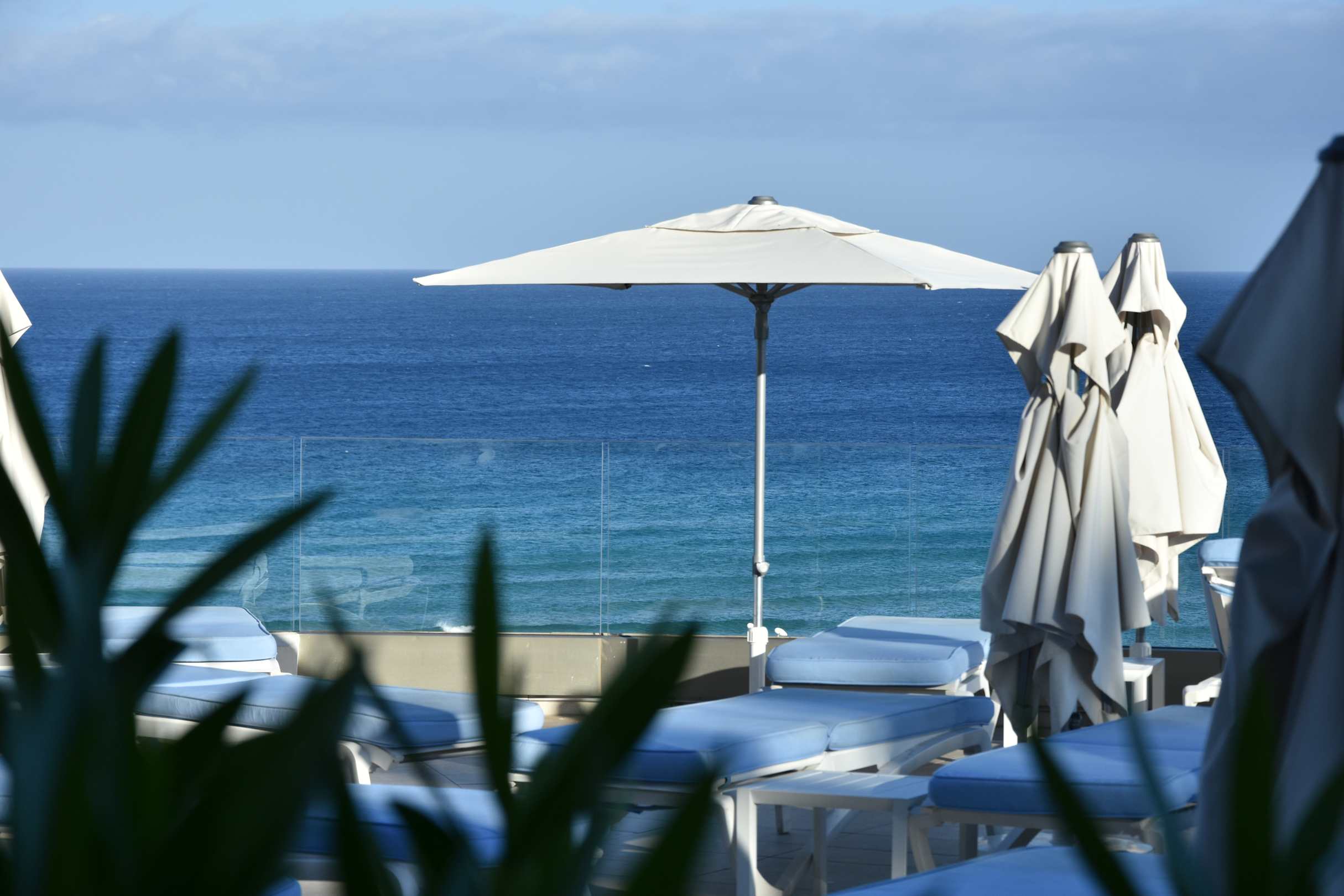 bequeme Auflagen auf den Liegestühlen, traumhafter Blick aufs Meer