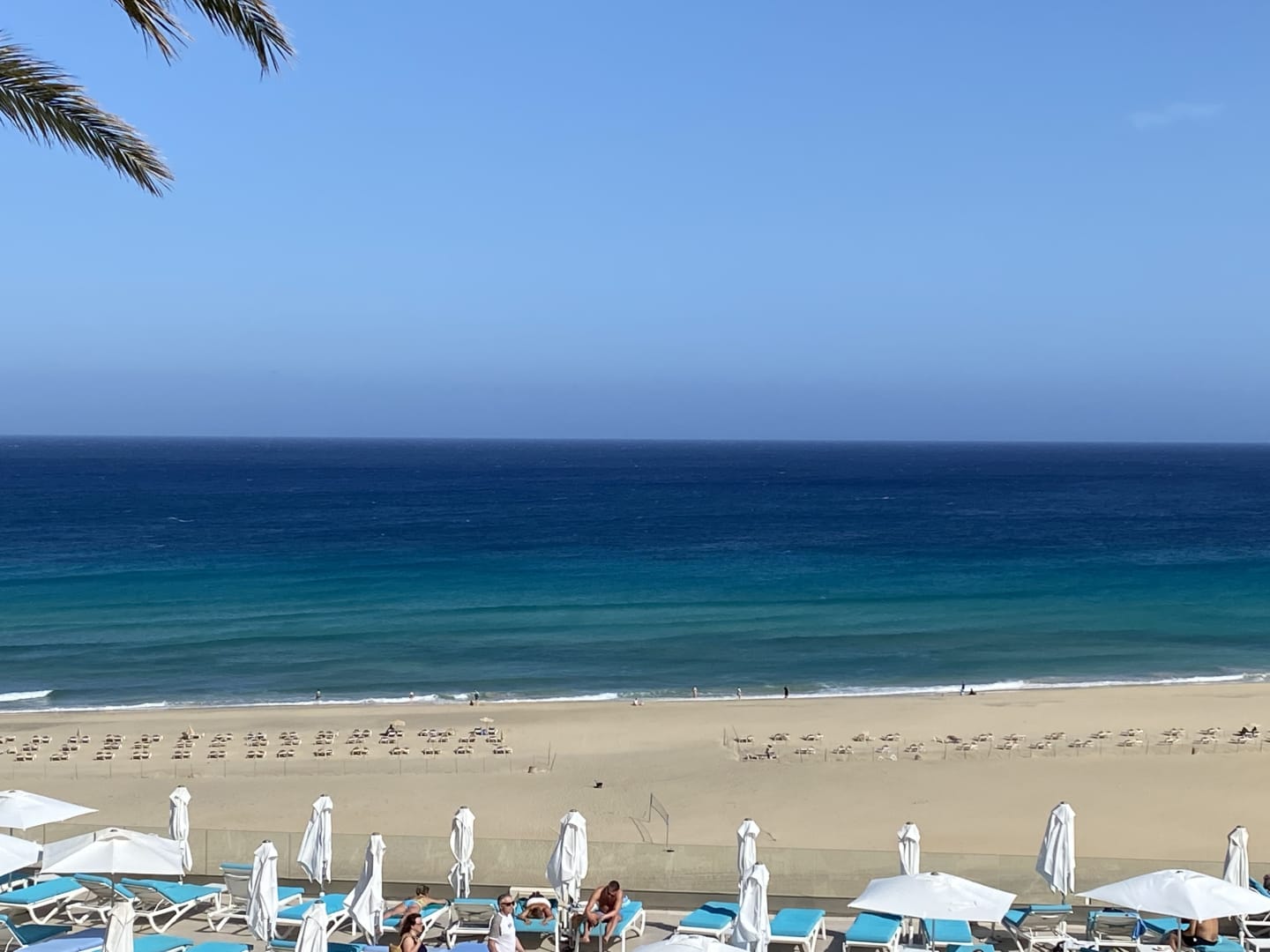 Blick von der Terasse bei der Bar über die Liegen auf den Strand