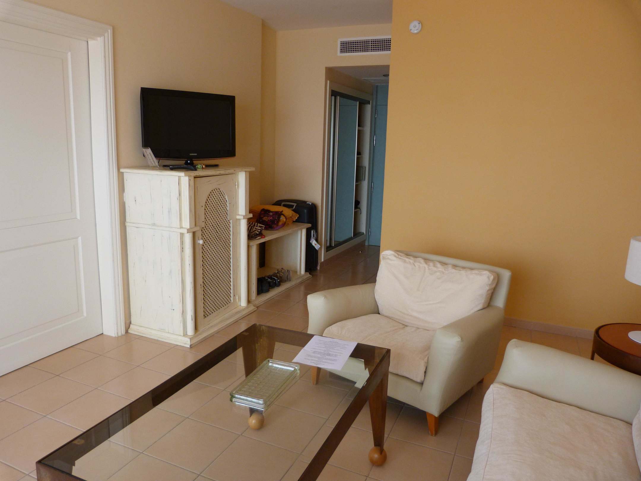 Wohnraum mit TVWohnzimmer der Suite mit Flat-TV. Hinten links der Kleiderschrank, rechts gehts zum Bad.