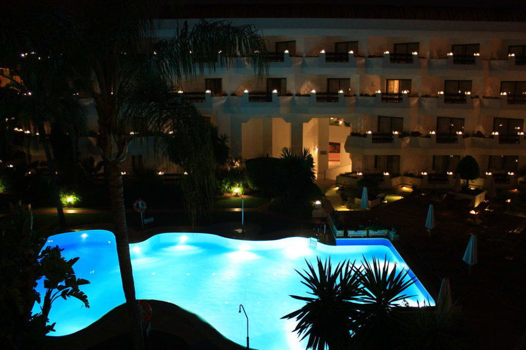Zimmerausblick auf den beleuchteten Pool bei Nacht