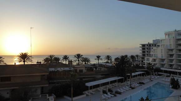 AusblickSonnenuntergang, gesehen vom Balkon; die Palmen gehören zum Hoteleigenen Strand (etwa 50 Meter entfernt).