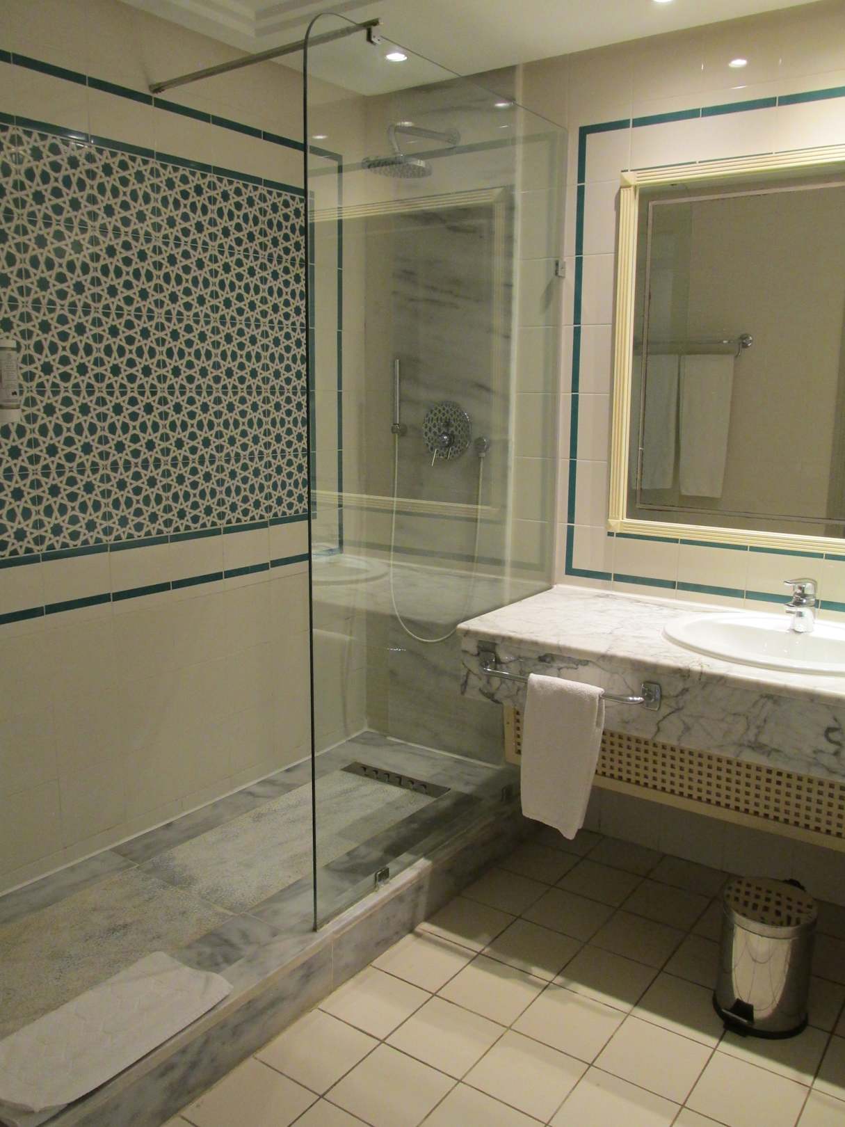 riesige Dusche und großer Waschtisch