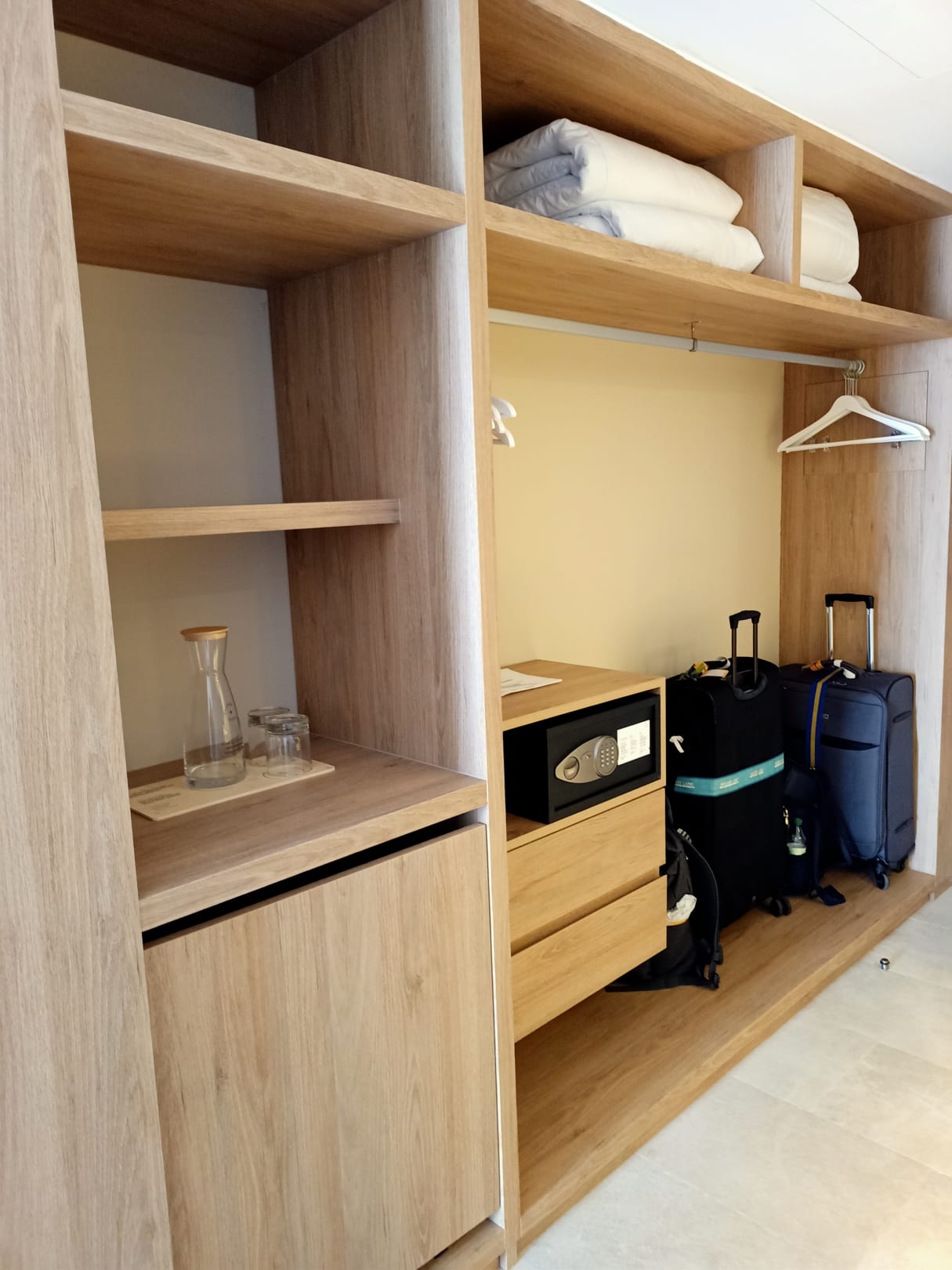 Der offene Kleiderschrank mit Kühlschrank und Save.