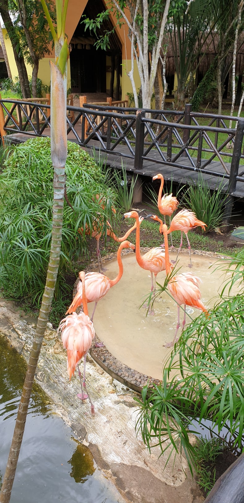 8 Flamingos im Hotelgarten