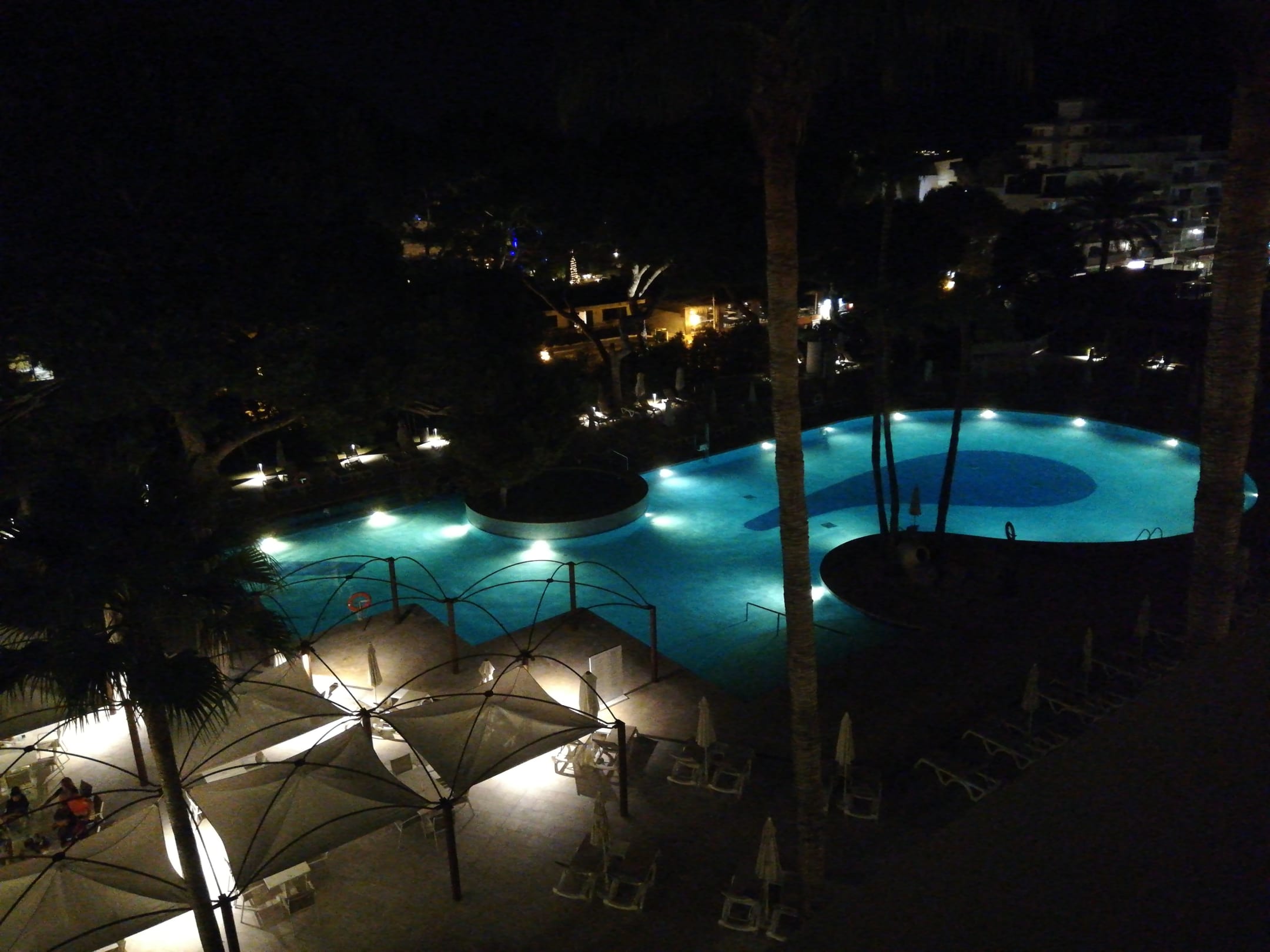 Ausblick auf den Pool bei Nacht.