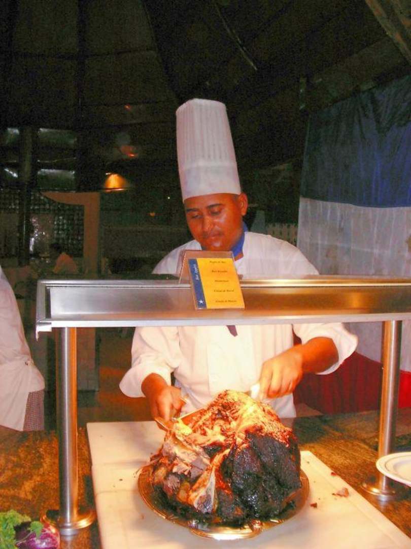 Koch beim Zerteilen der Rinderkeule