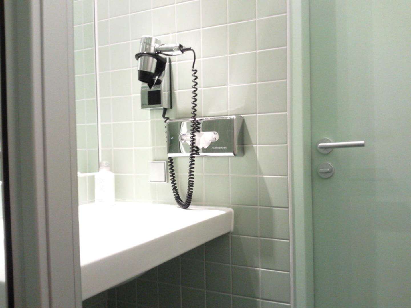 Föhn und Kosmetikbox im Bad