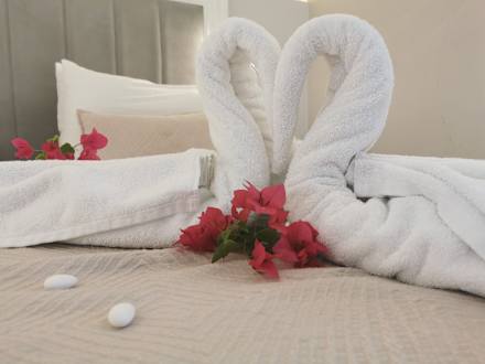 ZimmerMorgens um sechs angereist und das Zimmer war fertig. Dort angekommen war das ganze Bett so schön geschmückt