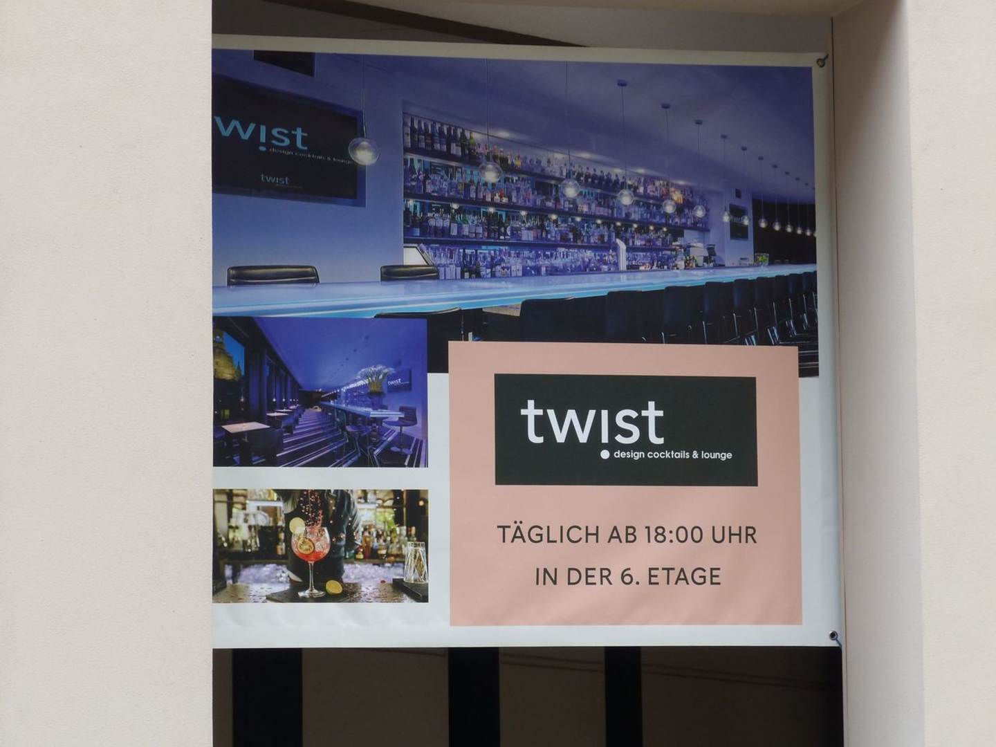 Außenhinweis auf die Twist-Bar in der 6. Etage