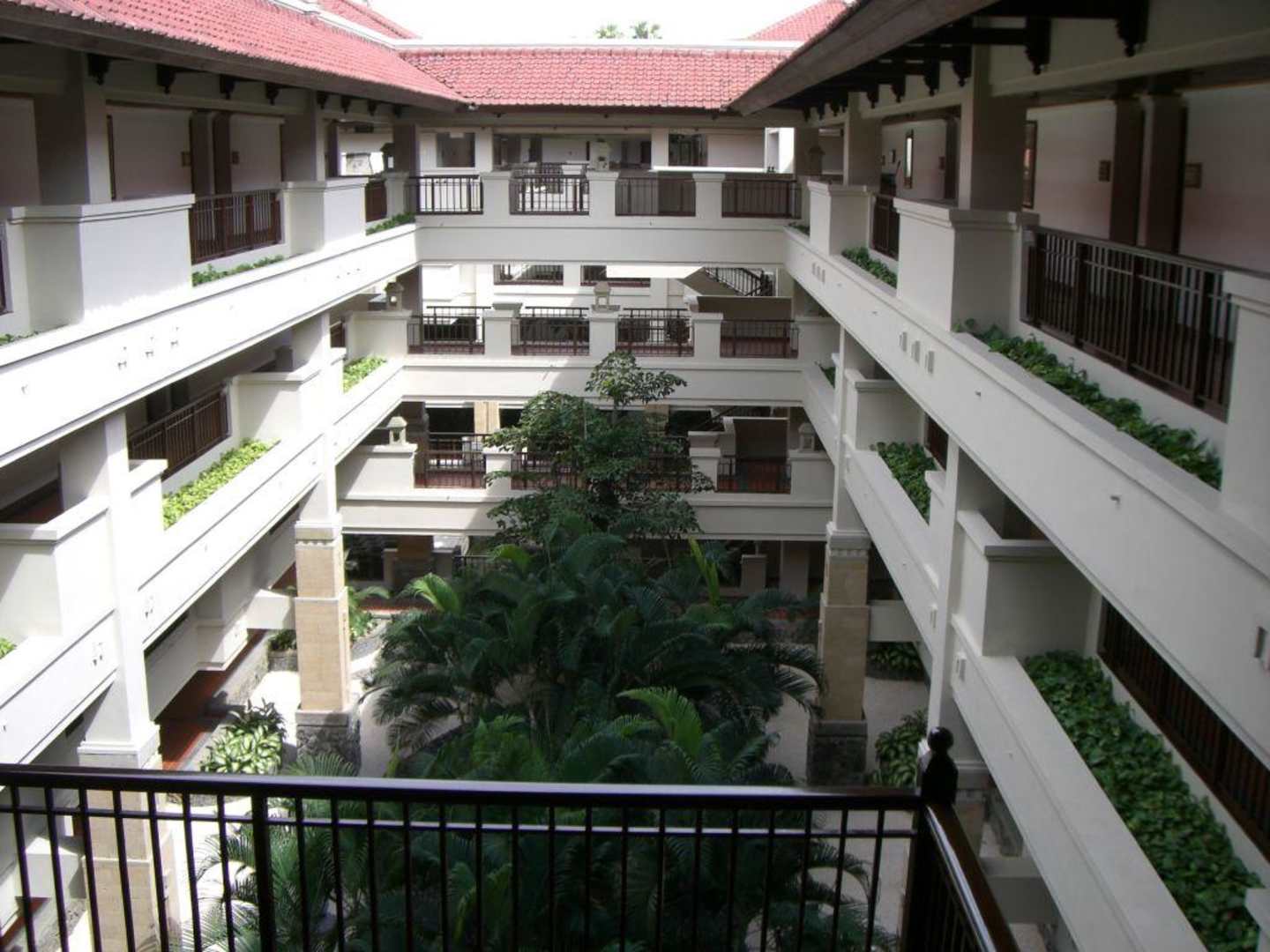 Hier ist der Innenhof eines Hotelflügels zu sehen