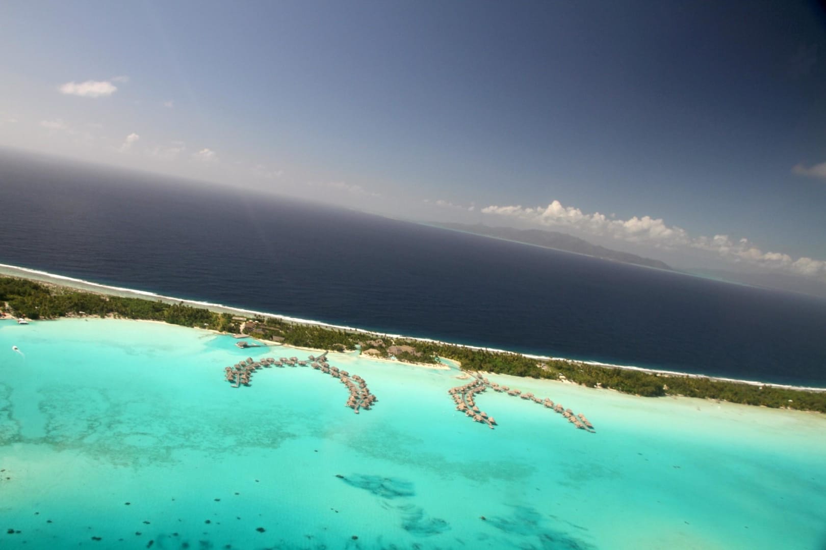 Vom Helikopter ein Foto aufs Hotel. Baden kann man nur auf der türkisfarbenen Seite. Im Hintergrund sieht man die Nachbarinsel Taha.