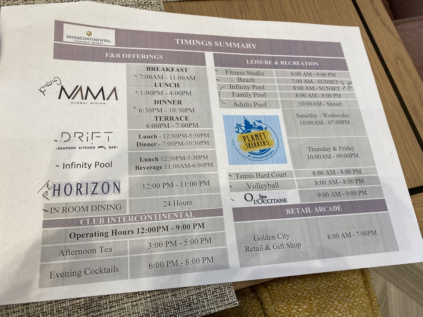 Info zu den Essens- und Poolzeiten