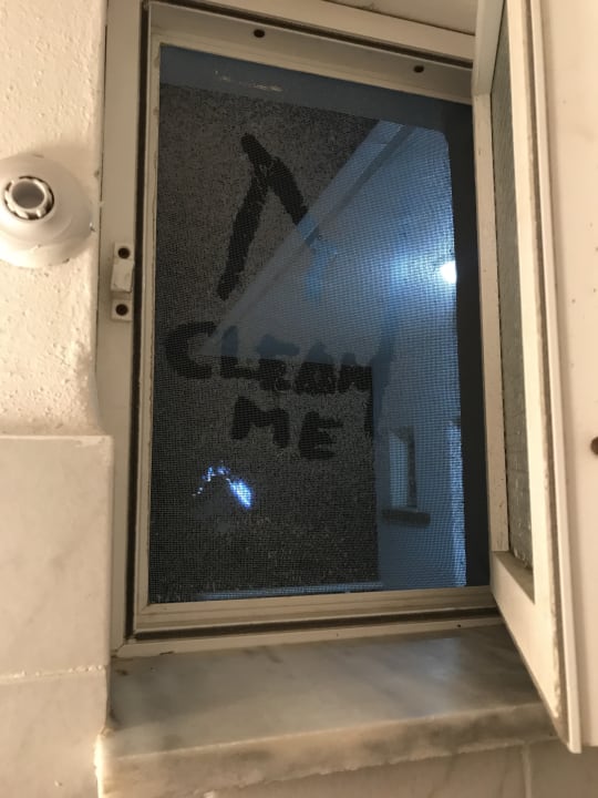 Fenster in der Dusche wo ich clean me in den Dreck geschrieben habe