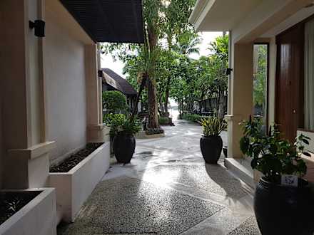 Blick durch den Gang von der Plaza in Richtung Strand