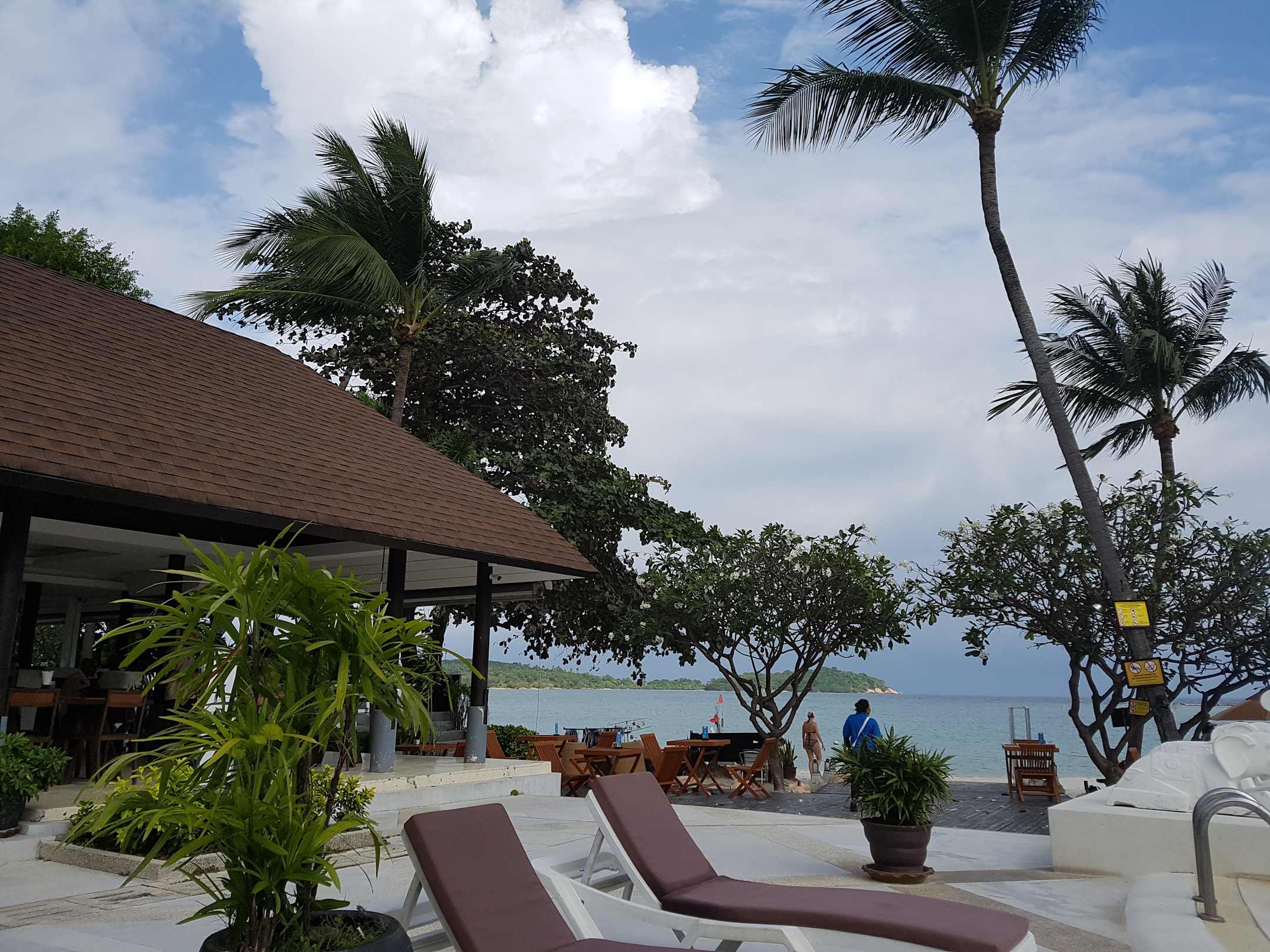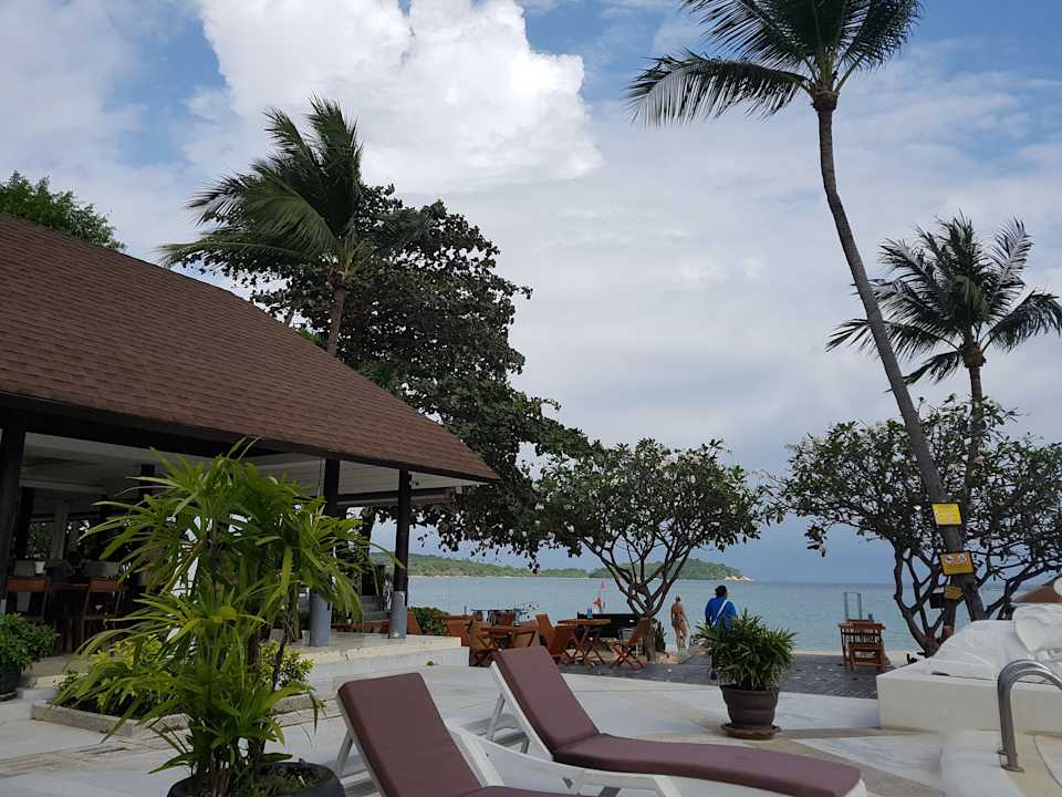 Blick von den Pool-Liegen zum Abgang zum Strand und zum Restaurant