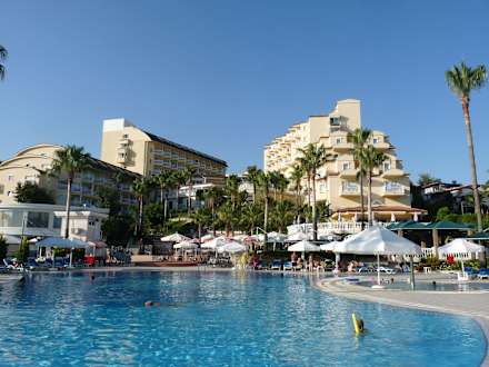 Blick vom Pool zum Hotel