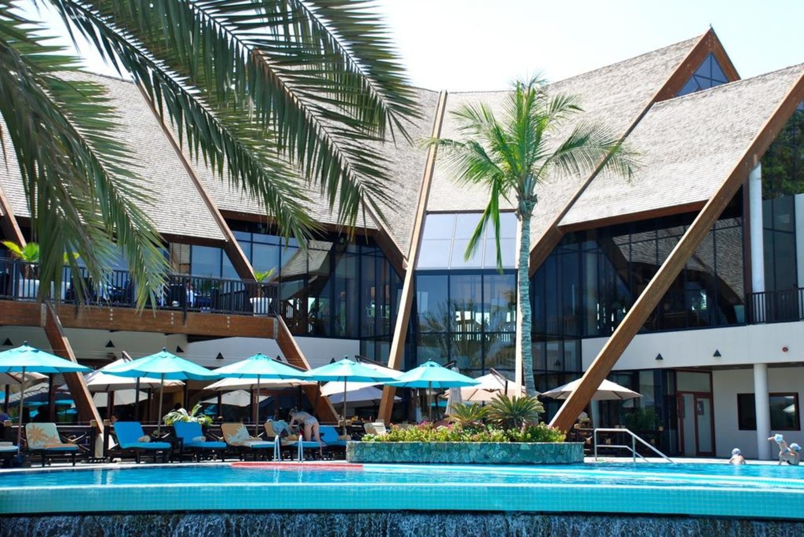 Im ersten Stock das asiatische Restaurant, eines von einer Vielzahl abwechslungsreicher Restaurants; im Vordergrund einer der Pools