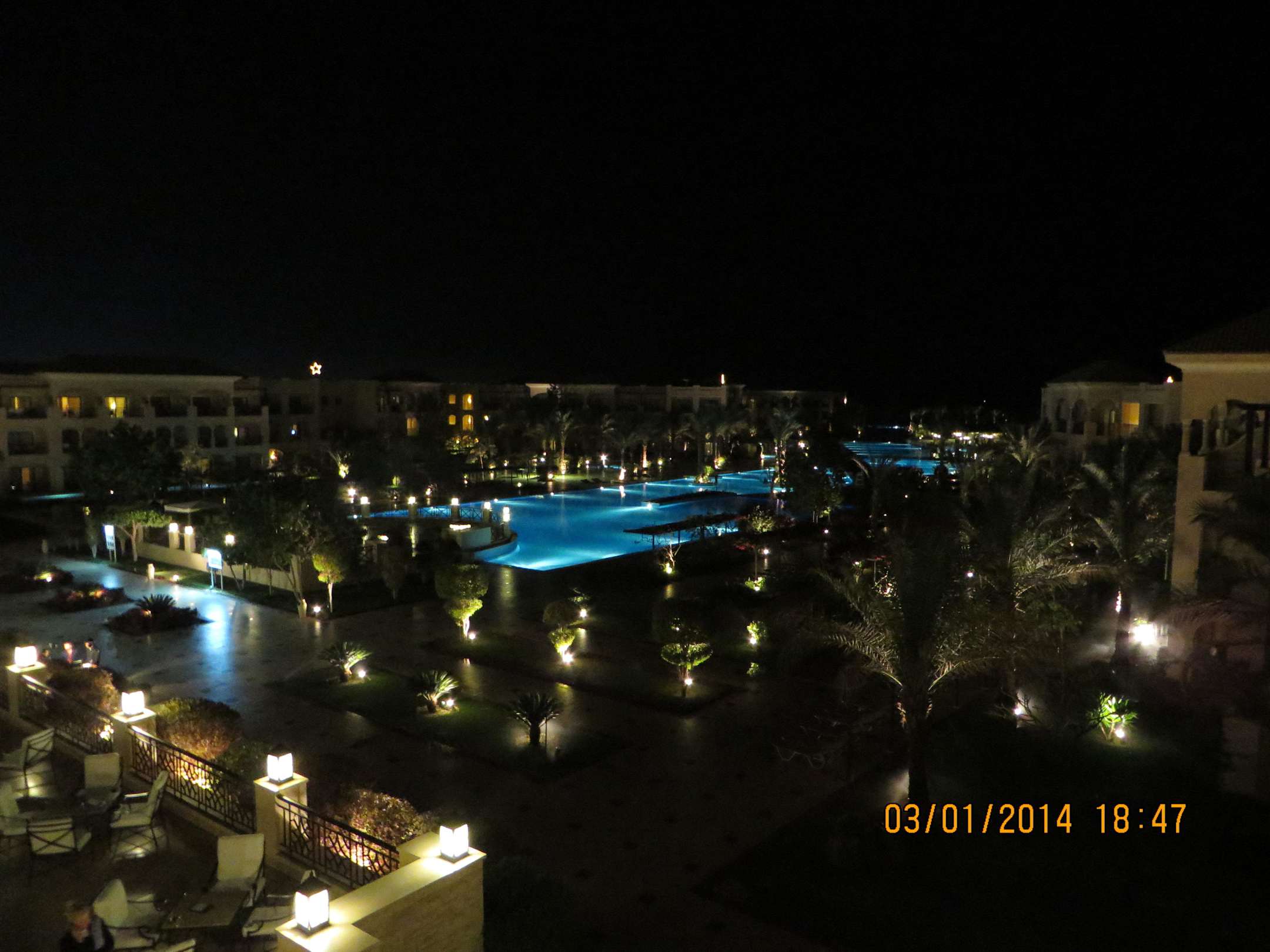 Ein Teil der Hotel- und Poolanlage bei Nacht