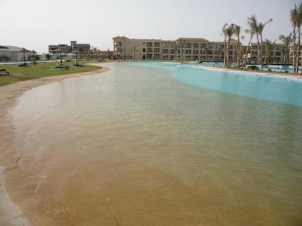 Einstieg in den hinteren Pool mit Strandatmosphäre