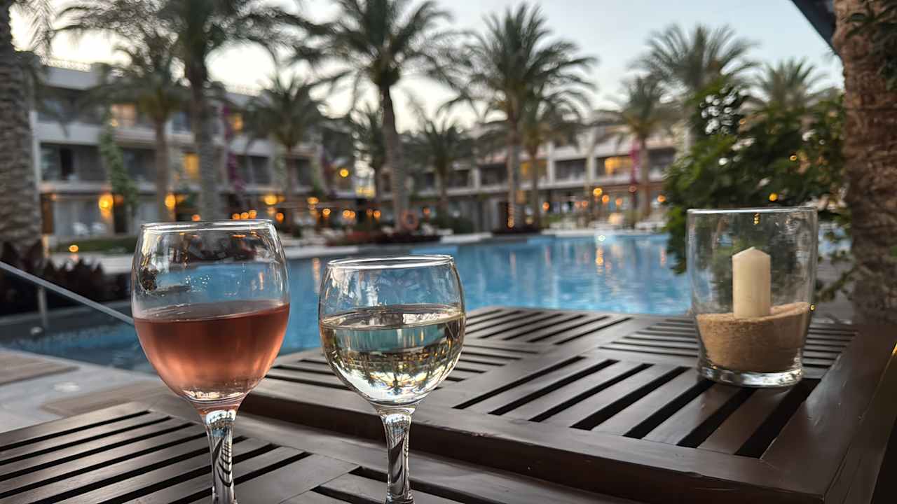 Ein Glas Wein in der Hotellobby bevor es zum Essen geht
