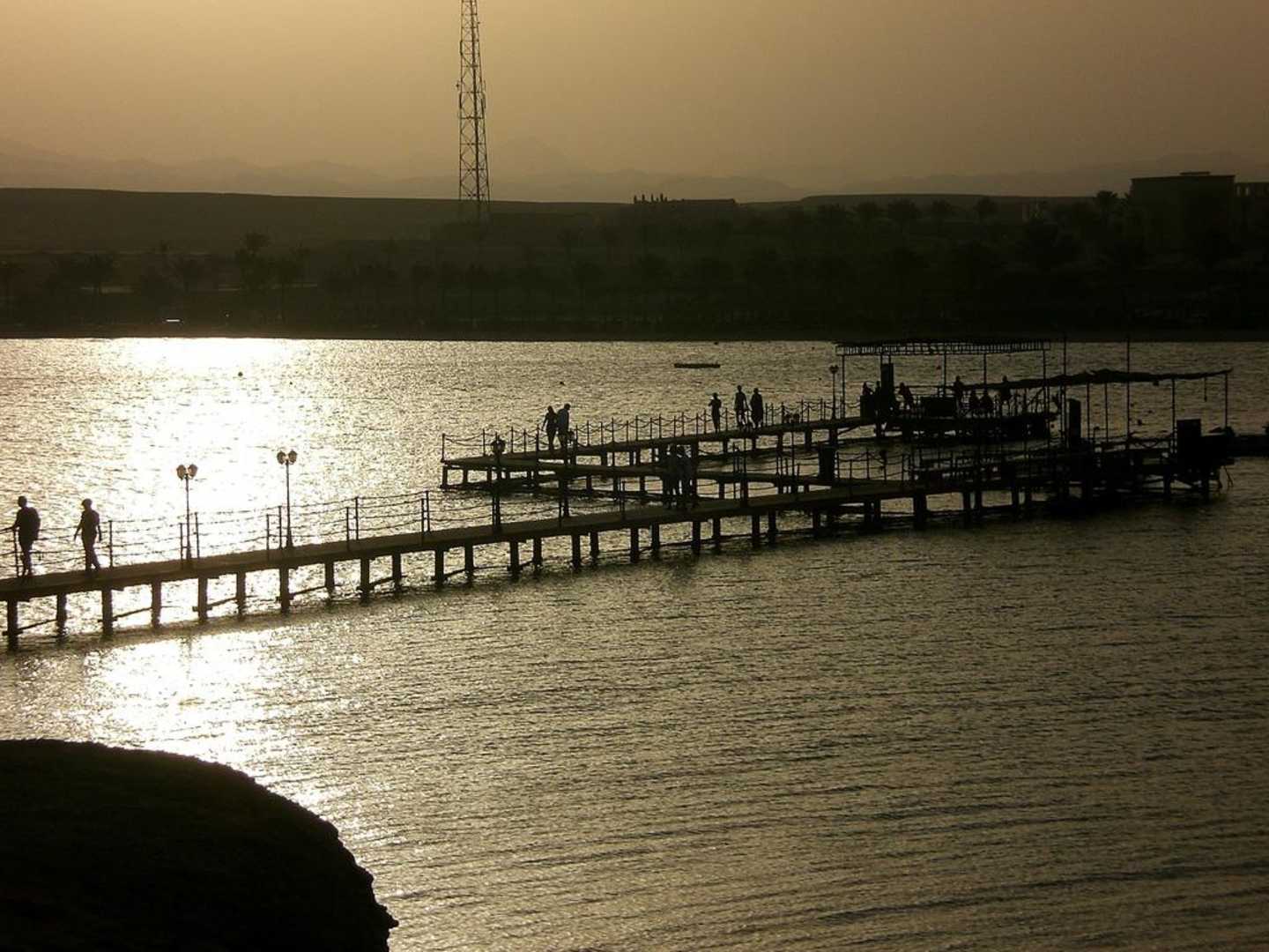 Der Steg im Sonnenuntergang. Von der ersten Plattform gehen die Taucher ins Wasser und von der hinteren die Schnorchler.