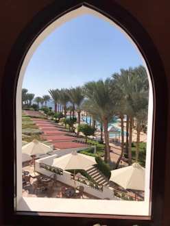 Blick aus dem Restaurant über die Anlage zum Meer