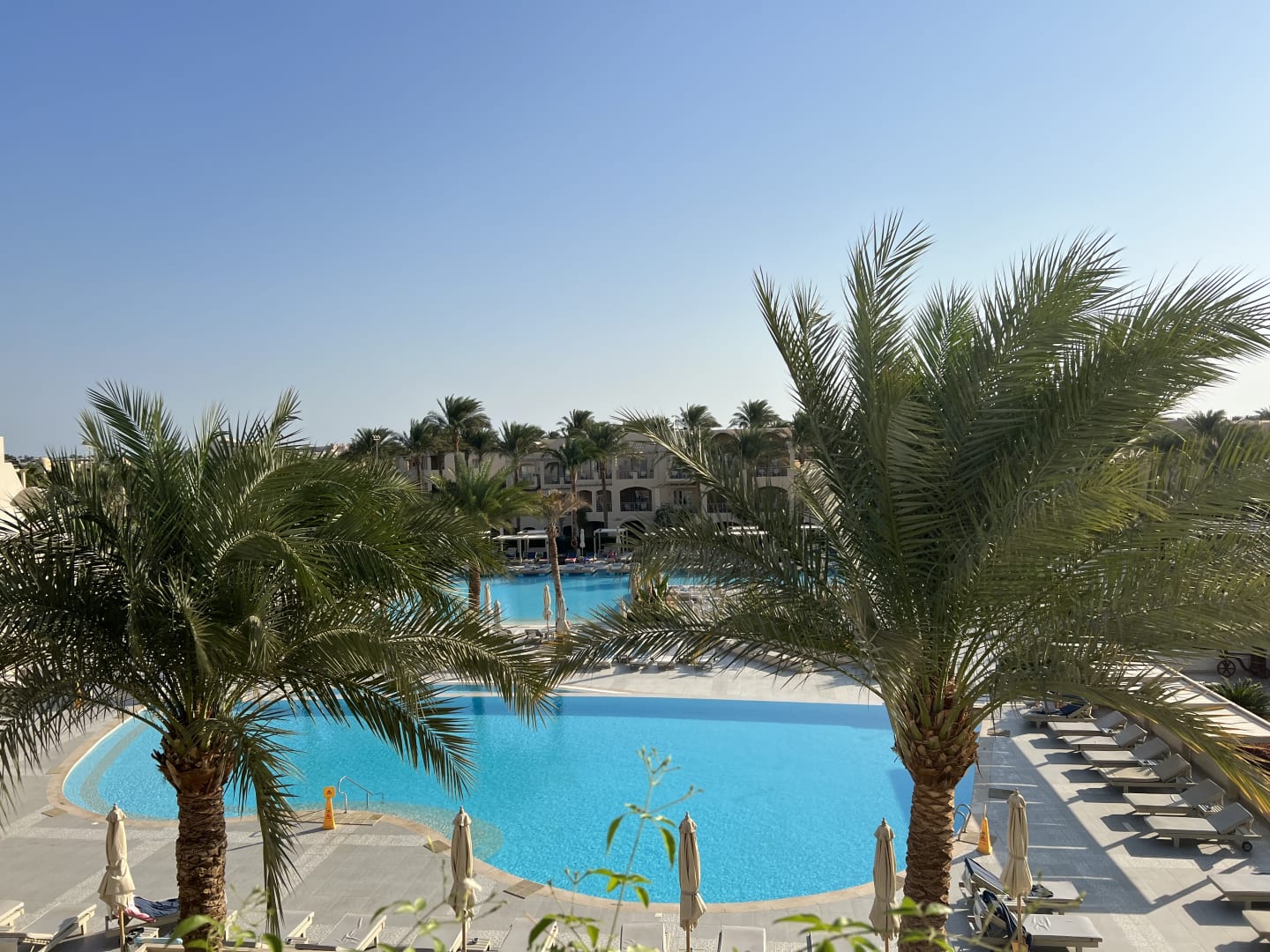 Blick vom Zimmer auf die Pools