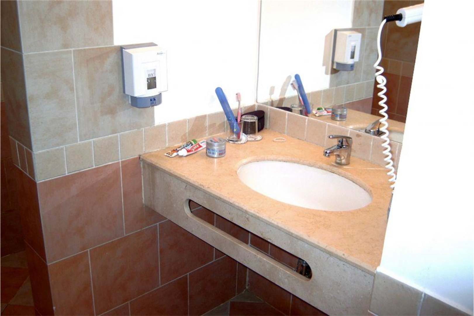 Viel Platz zum Deponieren der Bad-Utensilien / Schminkzeug. Guter Föhn ist auf dem Zimmer. Zum Zähneputzen Wasser - (kostenlos) im Kühlschrank im Zimmer - benutzen